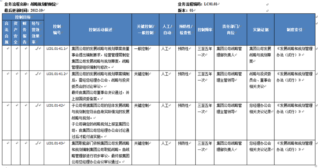 2、按照企事業(yè)單位所應(yīng)遵循的內(nèi)控要求(上市公司內(nèi)控指引、國(guó)資68號(hào)文等)開展管理要素與活動(dòng)的梳理,編制內(nèi)控體系文件,包括流程圖、風(fēng)險(xiǎn)控制矩陣以及相應(yīng)制度文件的修改,形成《內(nèi)部控制手冊(cè)》