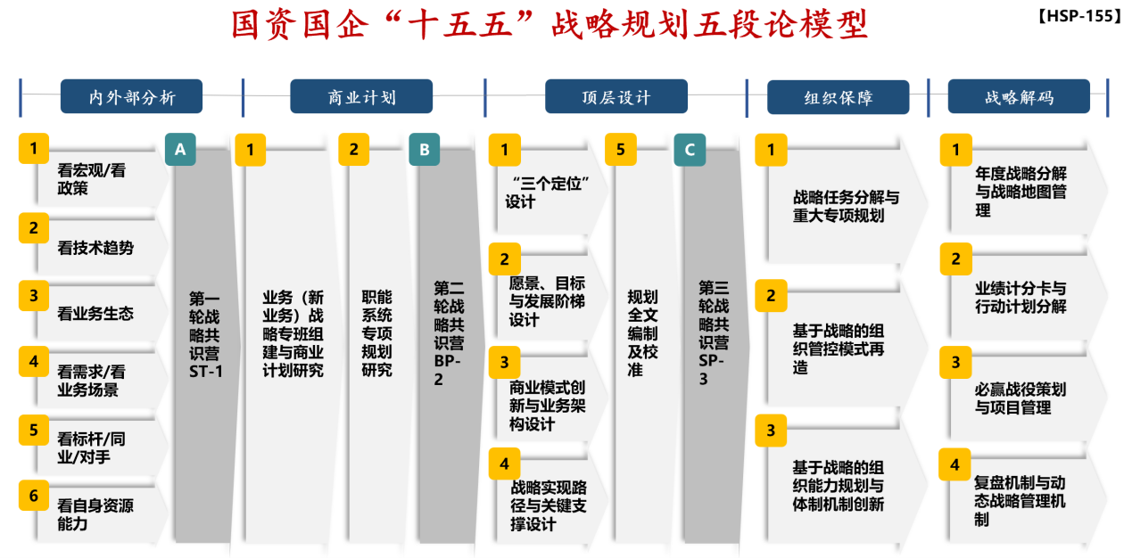 針對上述矛盾,結合本公司原創(chuàng)的國資國企十五五戰(zhàn)略規(guī)劃五段論模型(內外部分析、商業(yè)計劃、頂層設計、組織保障、戰(zhàn)略解碼),構建國企十五五規(guī)劃的系統(tǒng)解決方案,實現(xiàn)戰(zhàn)略引領、能力升級、價值創(chuàng)造的三位一體。