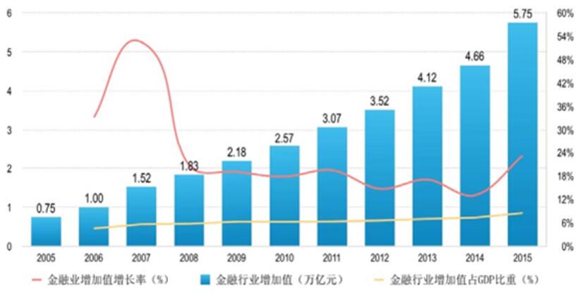根據(jù)國家統(tǒng)計局數(shù)據(jù),2009 年,我國金融業(yè)年增加值首次突破 2 萬億元,截至 2015 年我國金融業(yè)增加值已達 5.75 萬億元,占國內(nèi) GDP 比重的 8.50%。2008年以來,我國金融業(yè)產(chǎn)業(yè)增加值保持著近 20%的持續(xù)增長,占 GDP 的比例從 2005年的4.02%穩(wěn)步上漲至 2015 年的 8.50%。金融業(yè)在國民經(jīng)濟中扮演著越來越重要的角色,金融業(yè)的快速增長及其對 GDP 貢獻比例的提高,意味著金融行業(yè)的體量不斷擴大,對國民經(jīng)濟發(fā)展的作用越來越突出。