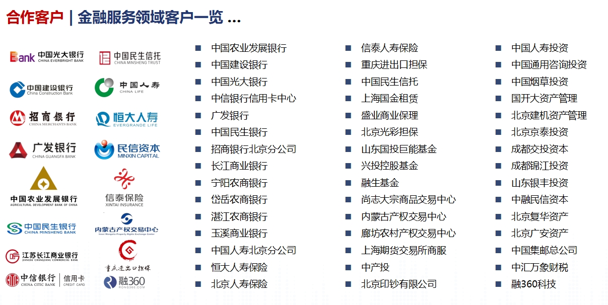 漢哲在金融行業(yè)的客戶以銀行業(yè)為主,涉及國有大型銀行、股份制銀行、城商行、農(nóng)商行等,同時也涉及保險、擔保、信托、基金、大宗商品、資產(chǎn)管理、互聯(lián)網(wǎng)金融等各類非銀金融機構(gòu),如:國壽投資、京泰投資、國投巨能基金、民生信托、重慶進出口擔保、中國人壽北京市分公司、尚志大宗產(chǎn)品交易中心、融360、中匯萬象財稅等多家金融企業(yè)。
