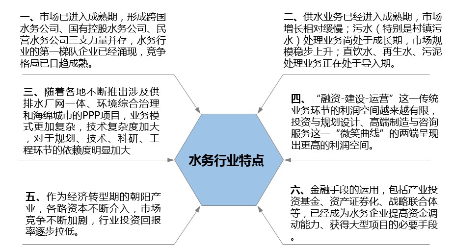 基于以上形勢,對于水務(wù)企業(yè)來說,社會資源、資金實力、規(guī)劃設(shè)計能力、項目運營與管理經(jīng)驗四者不可或缺,基于自身資源和優(yōu)勢打通局部或全產(chǎn)業(yè)鏈,成為企業(yè)發(fā)展乃至生存的必要條件。