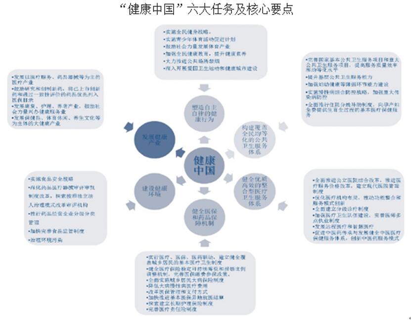 2016年10月25日國務院印發(fā)《“健康中國2030”規(guī)劃綱要》,這是史上首個且最高規(guī)格的健康產業(yè)規(guī)劃,從普及健康生活、優(yōu)化健康服務等六大任務出發(fā)對未來15年的健康工作進行了部署,其中中醫(yī)藥、家庭醫(yī)生及分級診療、康復與養(yǎng)老、藥品器械的創(chuàng)新及供應保障、“互聯網+醫(yī)療”以及ICL、醫(yī)療影像、血透等新興業(yè)態(tài)成為關注重點,醫(yī)療健康產業(yè)迎來全面利好。