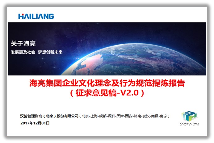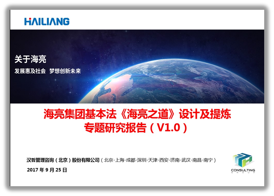 本次漢哲咨詢與海亮集團(tuán)的合作,是在集團(tuán)戰(zhàn)略轉(zhuǎn)型升級的關(guān)鍵時(shí)期,在對全球近20家可持續(xù)發(fā)展企業(yè)進(jìn)行深入研究的基礎(chǔ)上,為海亮量身定制企業(yè)管理基本綱領(lǐng)-《海亮之道》?!逗A林馈钒ê诵奈幕砟睢Ⅻh建工作指引、重大社會(huì)關(guān)系準(zhǔn)則、事業(yè)發(fā)展原則、組織發(fā)展政策、運(yùn)營控制政策、人才管理政策等七章44條,涵蓋了從企業(yè)頂層結(jié)構(gòu)到運(yùn)營管理的方方面面。同期,也發(fā)布了《海亮企業(yè)文化領(lǐng)要》,對企業(yè)的愿景、使命、核心價(jià)值觀、企業(yè)精神、干部員工行為準(zhǔn)則進(jìn)行了全新的詮釋。