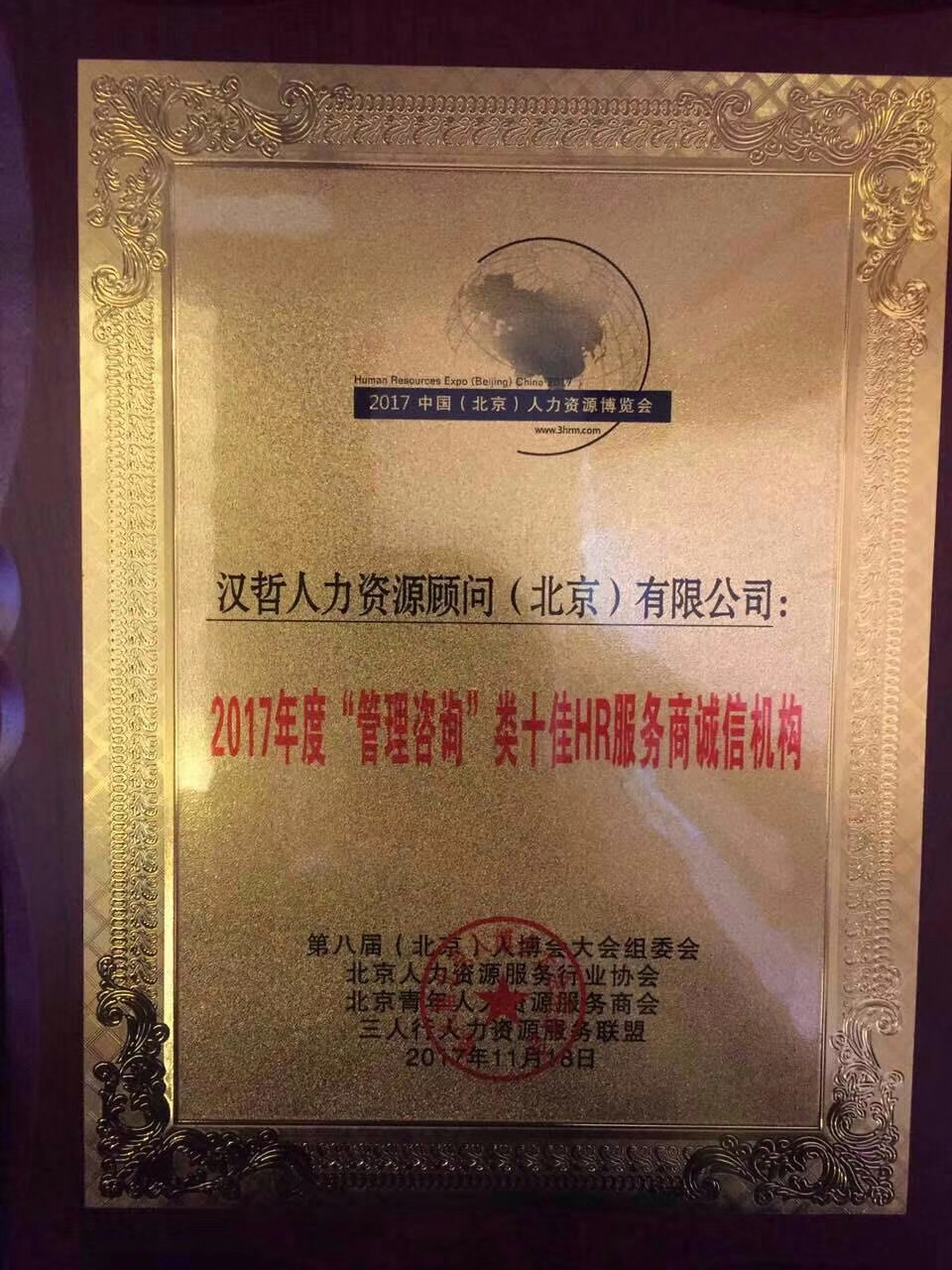 11月18日,第八屆人力資源管理博覽會(huì)在北京富力萬(wàn)麗酒店隆重開(kāi)幕,1500位企業(yè)人力資源工作者、企業(yè)人力資源服務(wù)機(jī)構(gòu)從業(yè)者參加了本次盛會(huì)。在本次大會(huì)上,漢哲咨詢(xún)集團(tuán)旗下的專(zhuān)業(yè)人力資源咨詢(xún)服務(wù)機(jī)構(gòu)-漢哲人力資源顧問(wèn)(北京)有限公司榮獲“2017年度十佳HR服務(wù)商”稱(chēng)號(hào),漢哲咨詢(xún)集團(tuán)副總裁、企業(yè)服務(wù)事業(yè)部(BSG)總經(jīng)理何承長(zhǎng)代表集團(tuán)參加了會(huì)議。