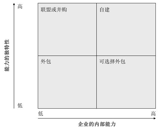 3. 通過什么途徑實現(xiàn):戰(zhàn)略具體通過什么樣的途徑(如:內(nèi)部自建、聯(lián)盟或外包等)來實現(xiàn)。在這方面,可以運用“企業(yè)內(nèi)部能力和外部能力獨特性”模型選擇戰(zhàn)略實施的策略和方式。如圖3所示。