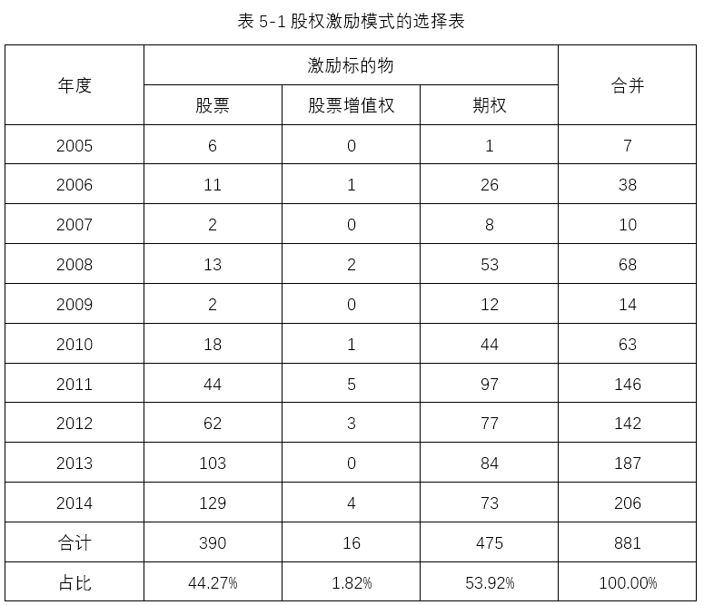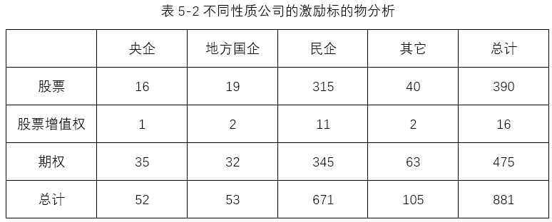 對(duì)于不同性質(zhì)的上市公司來(lái)說(shuō),其選擇股權(quán)激勵(lì)標(biāo)的物的偏好基本一致,總體來(lái)說(shuō)都是偏好股權(quán)激勵(lì),其次為股票激勵(lì),最后有較少的股票增激勵(lì)(如表5-2所示)