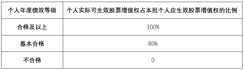 若激勵對象某一股票增值權(quán)行權(quán)期的個人年度績效等級為基本合格或以上,則其當(dāng)期績效表現(xiàn)達(dá)到生效條件,在滿足其他生效條件下,可以申請當(dāng)期實(shí)際可生效股票增值權(quán)的行權(quán);若激勵對象的個人年度績效等為不合格,則其當(dāng)期業(yè)績表現(xiàn)未達(dá)到生效條件,取消其該期股票增值權(quán)行權(quán)資格。