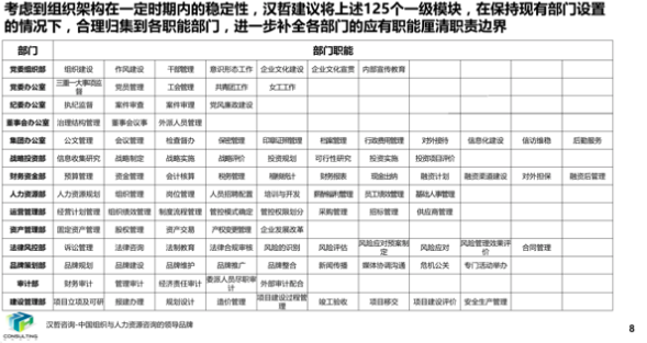 在集團組織結構優(yōu)化與崗位“三定”優(yōu)化過程中,通過分析集團總部現(xiàn)承載的職能模塊并梳理各部門現(xiàn)有職能,結合企業(yè)實際需要,對職能模塊進行了調(diào)整,避免多部門承載同職能模塊導致的職能邊界不清晰的情況。