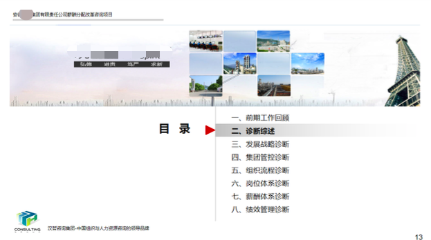 項(xiàng)目啟動(dòng)之初,通過內(nèi)部資料研究、企業(yè)深度訪談、員工調(diào)查問卷、外部標(biāo)桿資料對(duì)比,政策研究等維度對(duì)集團(tuán)發(fā)展戰(zhàn)略、集團(tuán)管控、組織流程、崗位體系、薪酬體系及績效管理系統(tǒng)進(jìn)行了全面診斷,發(fā)現(xiàn)問題并提出改進(jìn)的思路。