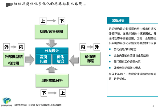 項(xiàng)目組從戰(zhàn)略意圖、價(jià)值鏈流程、組織功能分析、外部借鑒四個(gè)維度對(duì)公司的組織體系進(jìn)行了分析與優(yōu)化,提出了公司當(dāng)前的組織架構(gòu)優(yōu)化方案以及中長期組織架構(gòu)優(yōu)化與調(diào)整思路。