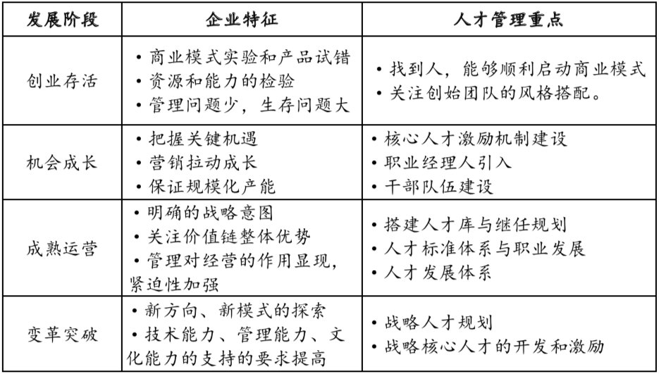 第一:保持與企業(yè)發(fā)展階段的適應(yīng)性:企業(yè)不同的發(fā)展階段,經(jīng)營的中心不一樣,相應(yīng)人才管理所需要解決的核心問題也就不同,借用愛迪斯的企業(yè)生命周期理論,將衰退期理解為變革轉(zhuǎn)型期的基礎(chǔ)上,將各階段人才管理的重點如下: