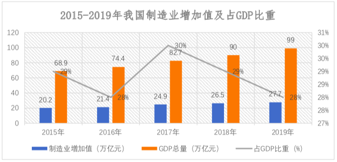 經(jīng)過數(shù)十年的發(fā)展,我國(guó)制造業(yè)不斷發(fā)展壯大,中國(guó)也成為了世界加工制造中心,根據(jù)國(guó)家統(tǒng)計(jì)局?jǐn)?shù)據(jù)顯示,2019年我國(guó)制造業(yè)增加值為27.7萬億元,持續(xù)占國(guó)民生產(chǎn)總值(GDP)28%左右的比重,行業(yè)規(guī)模不斷增大。