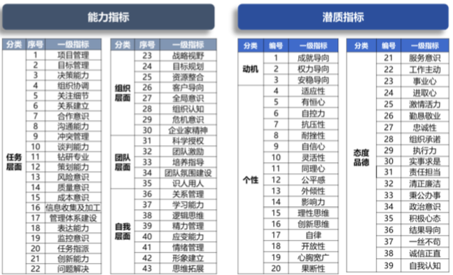 另一方面,筆者對當(dāng)前廣泛運(yùn)用于企事業(yè)單位的勝任力模型構(gòu)建、領(lǐng)導(dǎo)力模型構(gòu)建的素質(zhì)詞典進(jìn)行了研究歸納,同時,為了確保素質(zhì)指標(biāo)項更符合本土化的管理實(shí)際,筆者做了個別指標(biāo)的修訂工作,確保各項指標(biāo)契合中國企事業(yè)單位的管理實(shí)際,具備實(shí)效性和實(shí)用性。