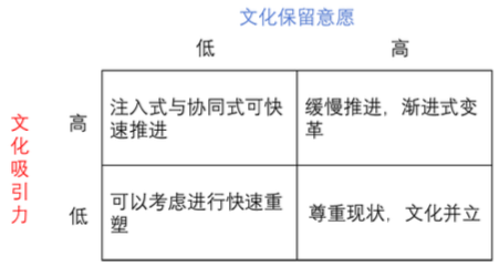 其次,看并購(gòu)企業(yè)的文化吸引力和被并購(gòu)企業(yè)的文化保留意愿,這點(diǎn)主要決定了文化整合推進(jìn)的快與慢。如下圖所示: