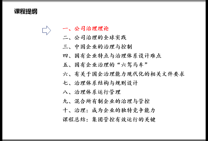 作為從事公司治理培訓(xùn)達(dá)15年的資深講師,段磊博士的課程從福特與康柏的故事開始,首先介紹了公司治理的理論體系、全球?qū)嵺`、中國企業(yè)的治理與控制模式、國有企業(yè)特點(diǎn)與治理體系設(shè)計難點(diǎn),在此基礎(chǔ)上,系統(tǒng)介紹了國企治理體系設(shè)計所依據(jù)的政策與文件精神,以及國企“六駕馬車”治理體系的結(jié)構(gòu)設(shè)計、規(guī)則設(shè)計與運(yùn)行管理體系設(shè)計。同時,基于混合所有制改革日益深入的趨勢,專題介紹了混合所有制企業(yè)的治理與管控方式,最后,以三家優(yōu)秀國企治理體系的設(shè)計與運(yùn)作作為結(jié)尾,深刻地提出了“讓公司治理成為企業(yè)獨(dú)特競爭能力”的論斷。