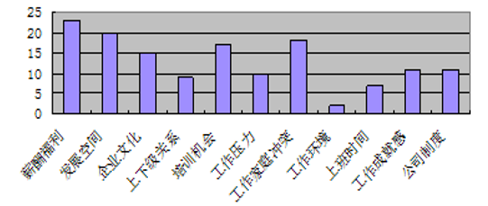 調(diào)研前,通過與人力資源部初步了解,S公司員工流失的原因是多方面的,既有公司的原因,也有員工自身的原因;有些原因是公司可控的,有些是無法控制的。因此,調(diào)研機構(gòu)把員工離職的原因定位于企業(yè)內(nèi)部,設(shè)計了主要包括薪酬福利、發(fā)展空間、企業(yè)文化、上下級關(guān)系、培訓(xùn)機會、工作壓力、工作家庭沖突、工作環(huán)境、上班時間、工作成就感、公司制度等十一項內(nèi)容的面談問卷。在與離職員工面談溝通的過程中,通過善意的引導(dǎo),盡可能獲得離職人員的真實想法。同時,調(diào)研機構(gòu)會詳細記錄面談的內(nèi)容,并對面談結(jié)果進行了統(tǒng)計(見下圖)。