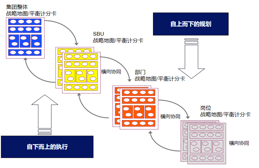 各SBU(子公司,戰(zhàn)略經(jīng)營/業(yè)務(wù)單位)BSC體系開發(fā)過程與集團層面基本一致,通過繪制SBU戰(zhàn)略地圖,承接集團戰(zhàn)略要求,并把SBU需要關(guān)注的重點在戰(zhàn)略地圖上體現(xiàn)出來,形成可視化的管理,在集團戰(zhàn)略地圖上的戰(zhàn)略舉措如果僅與單一SBU相關(guān),由一個SBU來承擔(dān)落實,這項舉措就直接落在該SBU戰(zhàn)略地圖上,如果某些戰(zhàn)略舉措涉及到跨SBU的協(xié)調(diào)和配合,就要將這些舉措進(jìn)行分解,依據(jù)相關(guān)SBU的職責(zé)分別是予以落實。