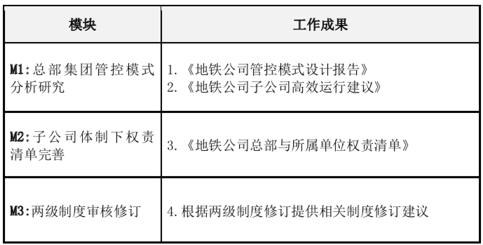 由于分改子之后,地鐵公司總部與所屬單位在公司治理結(jié)構(gòu)、管控模式與定位等方面進(jìn)行了調(diào)整,由此帶來總部與所屬單位在職責(zé)分工、權(quán)責(zé)劃分等方面也需要進(jìn)行同步調(diào)整,以便進(jìn)一步明確總部與所屬單位的權(quán)責(zé)界面,在此情形下,公司決定聘請外部機(jī)構(gòu)協(xié)助梳理總部與子公司的職責(zé)分工與權(quán)責(zé)邊界,促進(jìn)分改子體制改革扎實(shí)有效的落地。