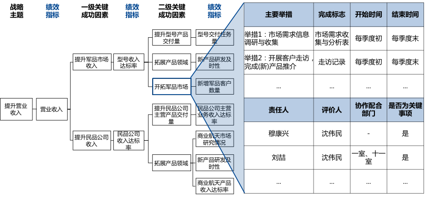 圍繞關(guān)鍵成功因素,制定實(shí)現(xiàn)關(guān)鍵成功因素的行動(dòng)計(jì)劃。行動(dòng)計(jì)劃是把關(guān)鍵成功因素轉(zhuǎn)化為具體、可實(shí)施的行動(dòng)舉措,并明確行動(dòng)舉措的完成時(shí)間、完成標(biāo)志及責(zé)任人。行動(dòng)計(jì)劃一方面可將結(jié)果性指標(biāo)分解、細(xì)化為具體工作任務(wù),作為過(guò)程指標(biāo),使指標(biāo)兼顧過(guò)程和結(jié)果;另一方面可將部門工作任務(wù)落實(shí)到人,為崗位考核提供基礎(chǔ),實(shí)現(xiàn)組織目標(biāo)的層層落地。