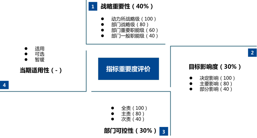 從戰(zhàn)略重要性、目標(biāo)影響度、部門可控性、當(dāng)期適用性四個(gè)維度建立指標(biāo)評(píng)價(jià)模型,由考核工作小組對(duì)各部門績(jī)效指標(biāo)進(jìn)行初次評(píng)價(jià),各部門負(fù)責(zé)人進(jìn)行復(fù)評(píng),選取評(píng)分排名靠前的指標(biāo)作為當(dāng)期部門績(jī)效考核指標(biāo),最終由考核領(lǐng)導(dǎo)小組審核確認(rèn)入選指標(biāo)。入選指標(biāo)每年由考核工作小組根據(jù)當(dāng)年實(shí)際工作進(jìn)行動(dòng)態(tài)更新,如研究所戰(zhàn)略或工作目標(biāo)發(fā)生調(diào)整,則需重新進(jìn)行指標(biāo)評(píng)價(jià)。