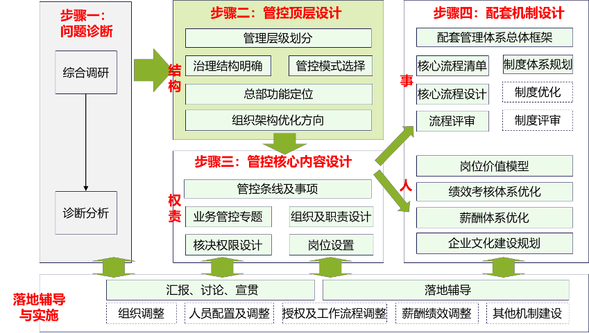 首先,基于調(diào)研診斷,明確組織管控問題解決總體步驟及邏輯思路,從方案設(shè)計(jì)和落地實(shí)施雙向推動(dòng)。