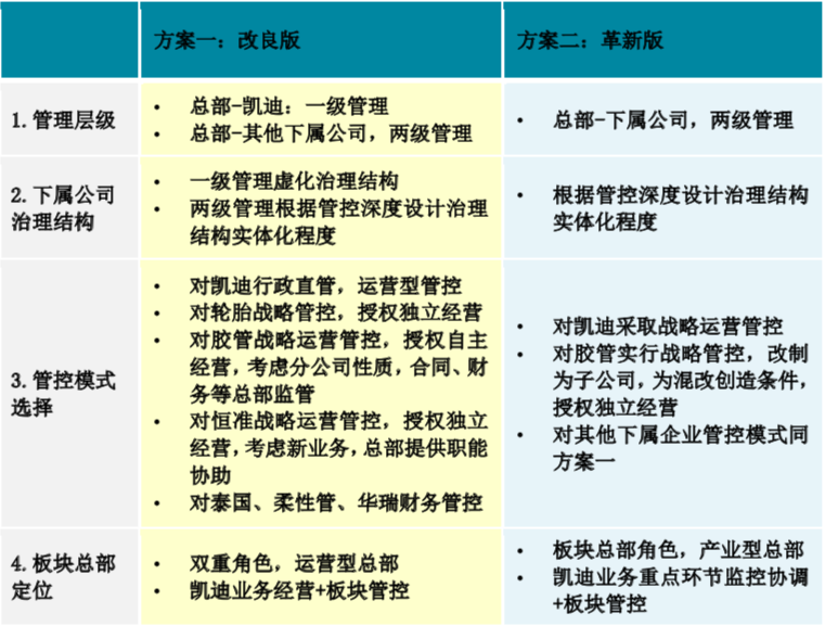 針對(duì)的實(shí)際情況,首先需要明確管控層級(jí)及總體的總部與下屬企業(yè)管控關(guān)系問題,漢哲提出以下兩種解決方案,改良版和革新版,考慮組織管控變革的難度與落地效果。