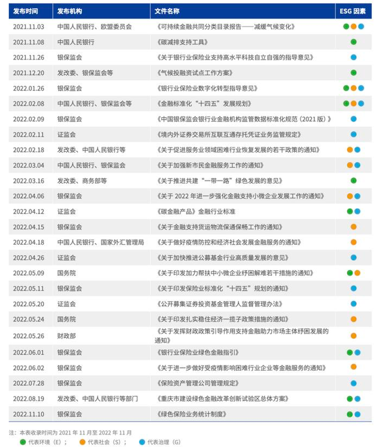 雖然ESG這一概念在2007年才被正式提出來,但是進入21世紀(jì)以來,我國陸續(xù)出臺了一系列相關(guān)政策法規(guī)來規(guī)范和引導(dǎo)ESG活動。 最早可追溯到2002年初,中國證監(jiān)會、原國家經(jīng)濟貿(mào)易委員會聯(lián)合發(fā)布了《上市公司治理準(zhǔn)則》,闡明了我國上市公司治理的基本原則,自此至2022年底,我國一共出臺了84部政策法規(guī)。僅2021年11月至2022年11月一年內(nèi)的ESG相關(guān)政策文件就有22個(如下圖)。