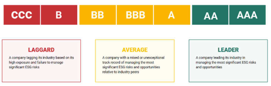 1ESG至今并沒有全球統(tǒng)一的定義和評級標(biāo)準(zhǔn)。各評級體系往往會基于GRI、SASB等的ESG披露標(biāo)準(zhǔn),根據(jù)MSCI或申萬等行業(yè)分類選取不同的指標(biāo)并構(gòu)建方法論,最終形成評價體系。以用的最多的MSCI為例,MSCI ESG評級模型指標(biāo)體系主要由3大范疇(Pillars)、10項主題(Themes)、35個ESG關(guān)鍵議題(ESG Key Issues)和上百項指標(biāo)組成。通過一系列企業(yè)自身披露的數(shù)據(jù)以及其它替代數(shù)據(jù)進行分析,最終確定企業(yè)評級。MSCI企業(yè)評級總共7級,最高為AAA,最低為CCC(如下圖)。