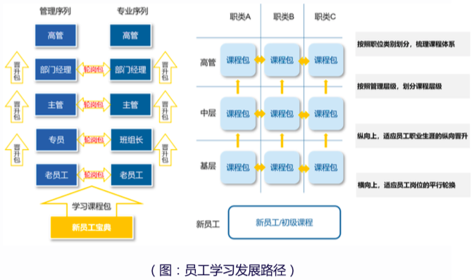 通過學(xué)習(xí)地圖,員工可以清楚地看到從一名基層新員工至成為公司業(yè)務(wù)專家(專業(yè)序列)或者高層領(lǐng)導(dǎo)(管理序列)的學(xué)習(xí)發(fā)展路徑。