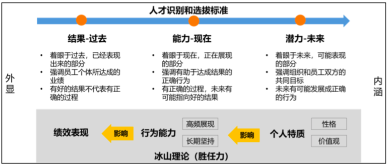 越來越多的企業(yè),不再僅僅依據(jù)過去的表現(xiàn)-”績效“這個單一維度來評估和選拔人才,而更加關(guān)注他們正在展現(xiàn)出來的、以及未來可能會表現(xiàn)的部分,對人才的評估更加全面。在人才盤點(diǎn)中,正是以發(fā)展的視角,從“績效結(jié)果、能力、潛力”多個維度去識別和挖掘人才,分別對應(yīng)著人才成長時(shí)間軸上的過去、現(xiàn)在、未來。