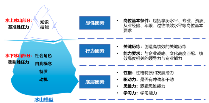 “人才畫像”的起源借鑒了互聯網“用戶畫像”的理念,它是以“用戶思維”來了解人才的一種理念、方法和手段。從當前企業(yè)人才管理現狀來看,關鍵崗位承擔著企業(yè)重要的工作職責,更加需要優(yōu)秀的人才來適配。因此,構建關鍵崗位“人才畫像”,明確人才標準,按圖索驥,對企業(yè)找到合適的人才意義重大。結合過往人才發(fā)展項目實踐案例,崗位人才畫像是由基于企業(yè)在招聘、選拔人才時發(fā)布顯性的職位描述和隱性的內在潛質要求共同組成,包括關鍵崗位中從冰山上層的知識技能、經驗,到冰山下層的能力素質、性格特質、驅動力、動機、價值觀等一系列綜合因素。