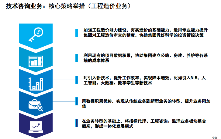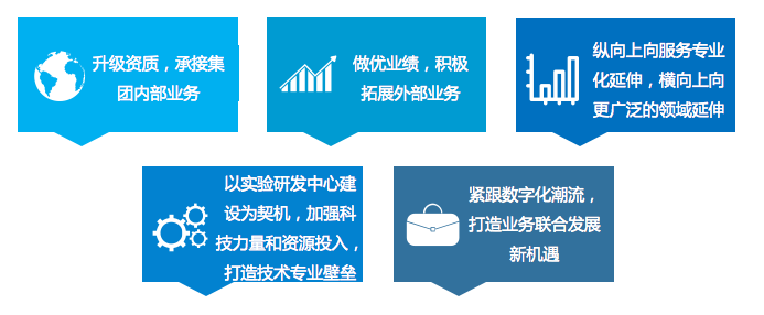 項(xiàng)目組通過對試驗(yàn)檢測、工程咨詢、工程監(jiān)理、檔案管理四大業(yè)務(wù)領(lǐng)域深入分析和研究,結(jié)合工程咨詢業(yè)務(wù)現(xiàn)狀及集團(tuán)內(nèi)部資源狀況,對各項(xiàng)業(yè)務(wù)提出明確的功能定位、發(fā)展目標(biāo)及發(fā)展路徑,解決公司各項(xiàng)業(yè)務(wù)的總體定位和布局,以及“十四五”未來2年的增長路徑。