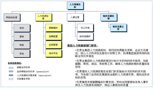 其中,部門職責(zé)是在公司戰(zhàn)略的指導(dǎo)下、基于部門角色確定的,以集團(tuán)人力資源部為例,如下圖所示,其扮演四種角色:戰(zhàn)略合作伙伴、業(yè)務(wù)職能的合作伙伴、人力資源技術(shù)提供者和行政事務(wù)專家,要扮演好不同的角色,就需要有相應(yīng)的職責(zé)進(jìn)行支撐。