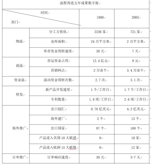 海爾集團(tuán)業(yè)務(wù)流程再造的效果如下表所示。從圖表中可以看到,經(jīng)過流程再造,海爾集團(tuán)在物流、商流、資金流方面都取得了巨大進(jìn)展,在研發(fā)、海外推廣、訂單推廣方面也取得了不菲的成績(jī)。