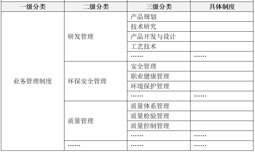 根據(jù)企業(yè)的業(yè)務(wù)主流程,將相似、相近、相關(guān)的經(jīng)營管理活動進行歸并,可以確定業(yè)務(wù)管理制度的分類。一般來說,業(yè)務(wù)管理制度包括業(yè)務(wù)拓展與營銷管理、研發(fā)管理、生產(chǎn)管理(項目管理)、供應(yīng)鏈管理、質(zhì)量管理等若干二級制度模塊,與企業(yè)業(yè)務(wù)主流程是相吻合的。