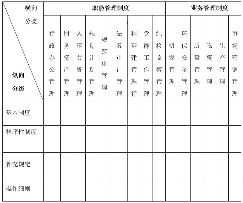 結(jié)合職能設(shè)置、管理流程的梳理以及內(nèi)外部制度環(huán)境的影響,對單體企業(yè)層面制度進行橫向分類。橫向分類劃分為:支持管理制度、業(yè)務(wù)管理制度2個一級分類,還可以進一步細(xì)分為二級制度分類、三級制度分類。根據(jù)管理制度的細(xì)分,需要對管理制度分類層層細(xì)化,力求做到無交叉、無遺漏、無重復(fù),使之涵蓋管理的方方面面。根據(jù)一類職能中工作流程的先后順序?qū)υ撀毮苓M行橫向細(xì)分,將相似、相近、相關(guān)的經(jīng)營管理活動歸并為一類職能;其次,對于該項職能中比較重要的下一級細(xì)分職能可以根據(jù)管理的需要提升到與其同等的層次。