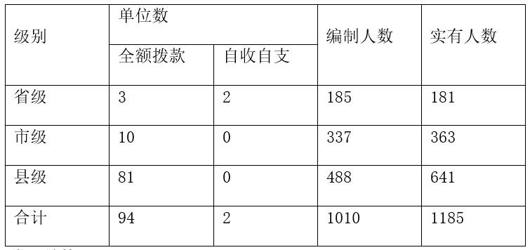 藥監(jiān)系統(tǒng)包含了省屬、市屬和縣屬事業(yè)單位。省屬事業(yè)單位共有5個(gè),從經(jīng)費(fèi)來源看,其中3個(gè)為全額撥款事業(yè)單位,2個(gè)為自收自支事業(yè)單位;市屬事業(yè)單位10個(gè),縣屬事業(yè)單位81個(gè),全部為全額撥款事業(yè)單位。如表所示: