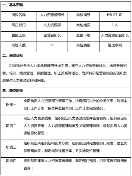 通過(guò)工作分析對(duì)崗位有了更為清晰了解的基礎(chǔ)上,形成了規(guī)范的《人力資源部部長(zhǎng)崗位說(shuō)明書(shū)》。