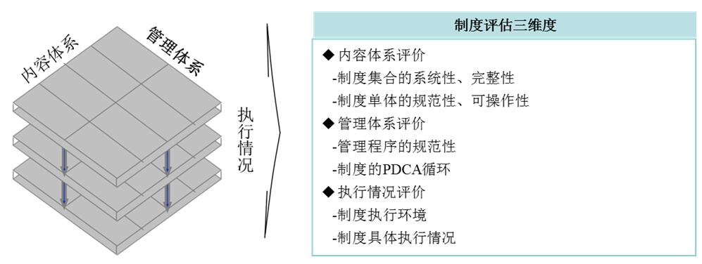 對于制度管理體系的評估,通常從宏觀管理(企業(yè)總體制度管理)、中觀管理(專項(xiàng)職能制度管理)和微觀管理(單體制度管理)三個層面進(jìn)行分類評估,每個層面評估工作的側(cè)重點(diǎn)不同,其中: