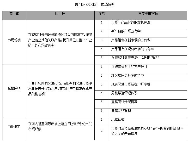 各部門(mén)的主管需要根據(jù)單位級(jí)的KPI建立部門(mén)級(jí)KPI,并對(duì)相應(yīng)部門(mén)的KPI進(jìn)行分解,確定相關(guān)的要素目標(biāo),分析績(jī)效驅(qū)動(dòng)因素(技術(shù)、組織、人),確定實(shí)現(xiàn)目標(biāo)的工作流程,分解出各部門(mén)級(jí)的KPI,以便確定評(píng)價(jià)指標(biāo)體系,如,根據(jù)單位級(jí)的“市場(chǎng)領(lǐng)先”戰(zhàn)略,確定部門(mén)級(jí)KPI。