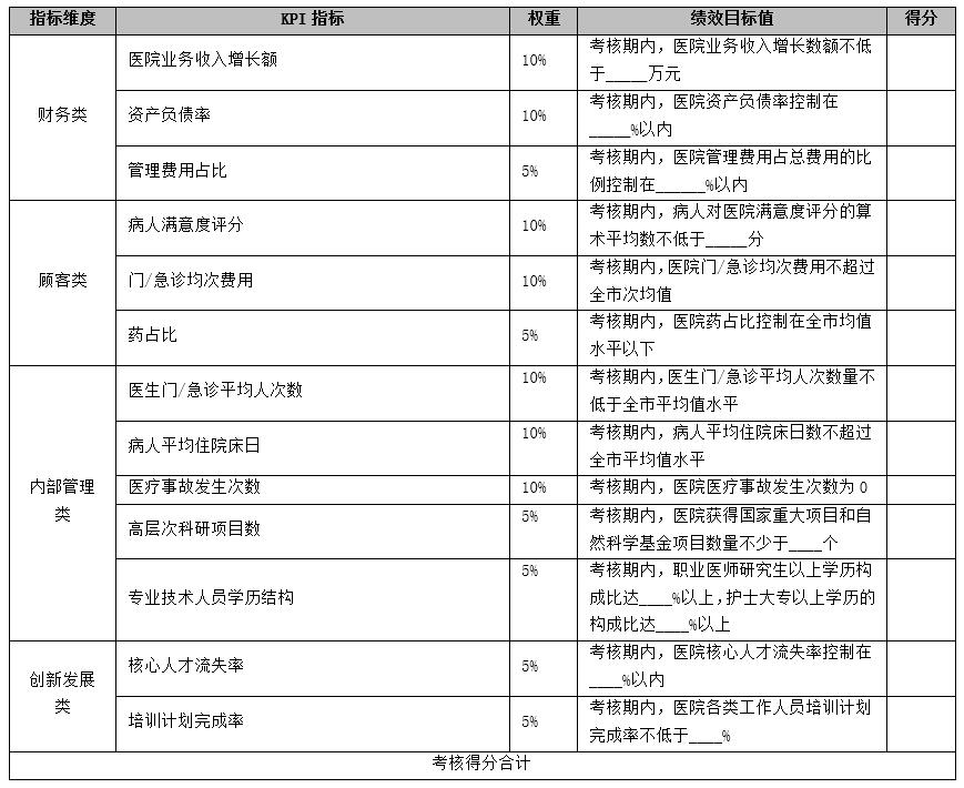 根據(jù)KPI指標(biāo)以及崗位職責(zé),形成了各個(gè)崗位的績效考核指標(biāo),由于崗位眾多,選取該醫(yī)院院長的考核指標(biāo)作為范例。