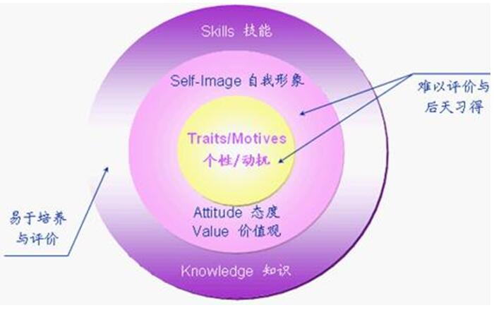 在素質(zhì)洋蔥模型中,知識(shí)、技能等外層要素易于培養(yǎng)和評(píng)價(jià),而個(gè)性和動(dòng)機(jī)等內(nèi)層要素則難以評(píng)價(jià)與后天習(xí)得。