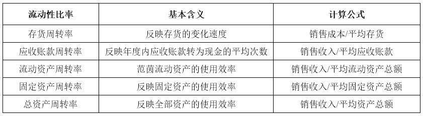 流動(dòng)性指標(biāo)分析的目的是觀察企業(yè)在一定時(shí)期內(nèi)資金的周轉(zhuǎn)情況,是對(duì)企業(yè)資金活動(dòng)的效率分析,主要指標(biāo)含義及計(jì)算公式如表3所示: